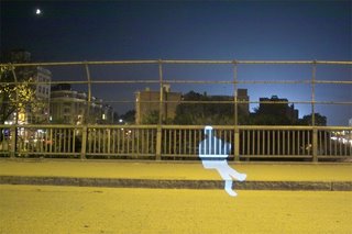 Light Attack is a media artwork, as well as social experiment, performed in public urban spaces. While driving through the city, an animated virtual character is projected onto the cityscape, exploring places ‘to go’ and places ‘not to go’, according to the popular Lonely Planet travel guide. I like the idea of creating a character, an ordinary tourist guide who travels around the city and specially the idea of public and private. It reminded me the work of Julian Opie. I also find interesting the question that rises from the project: property and privacy: how public is public space? How is ‘projection’, as a ubiquitous medium, changing the environment in which we live?